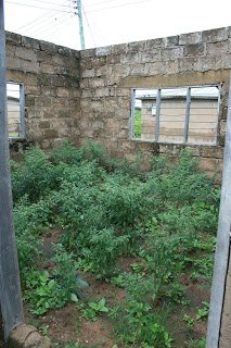Mark and I met in town and rode to German Soldier’s house, where he showed us his gardens. He had some small lettuce beds behind his house which had already been harvested, and he proceeded to show us the lot adjacent to his house. The owner of the lot was in the process of building a house and passed away, leaving behind walls and an empty yard. Abdul viewed this as an opportunity, and received permission to grow okra and peppers in the lot until its fate is sorted out. There was no wasted space to be found – I was impressed.