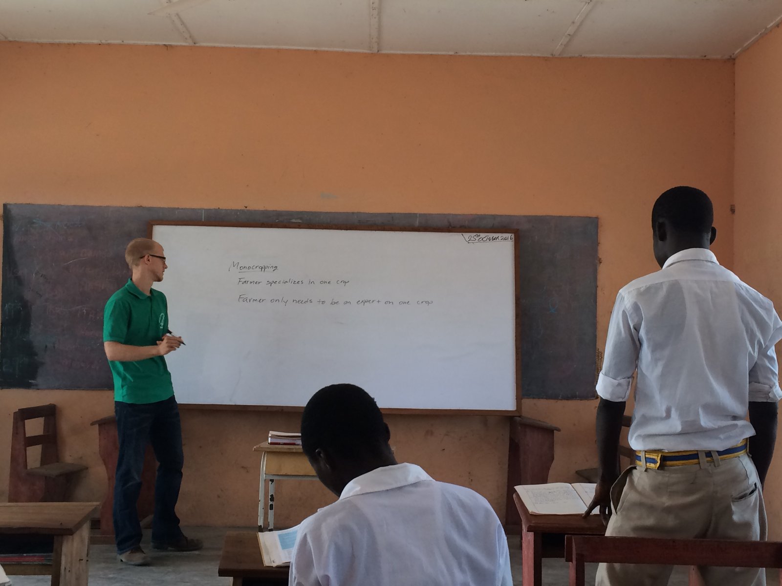 Prior to teaching, Mark informed me that I was responsible for 23 Agriculture students—17 third years andimg_3378 6 second years—and that the first year students would arrive by the start of the second term in January.  Buipe SHS was opened in 2011, but Agriculture was only offered starting in 2014, hence the small number of students. Other students specialize in Business, General Arts, or Home Economics. I spent the first week getting to know my students, which provided some fun conversations. I had them guess my age and received responses ranging from 20 to 30 years old, and many thought I was married with children. I also familiarized myself with the topics they had already covered which helped guide my planning.
