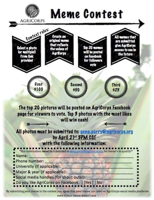 AgriCorps is hosting a Meme Creation Contest and you are invited to participate! Click HERE to access the photos and rules. What: The purpose of the meme contest is to promote AgriCorps, international agricultural education and make connections with agriculture students and universities across the U.S. When: Anyone who is interested in participating can submit […]