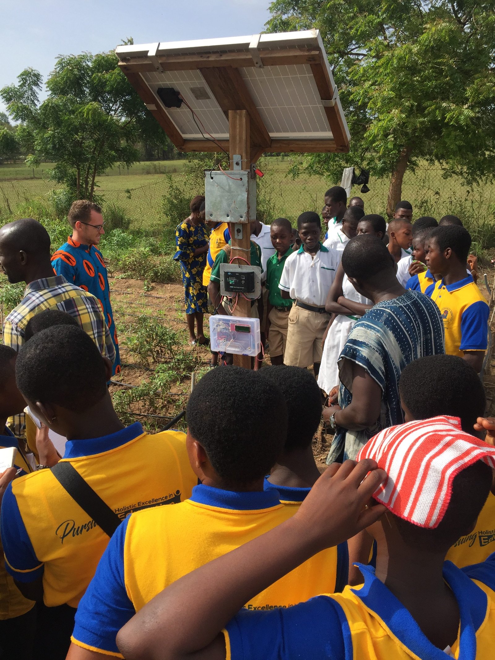 The day started off bright and early for the 32 students and 5 teachers with a tour of the UCC Farms. The research, teaching, and practical demonstration farm site exposed students to a solar powered drip irrigation project, designed by a theoretical physicist at UCC. The pump, the first of its kind in Ghana, communicates with soil moisture sensors to deliver water when needed for optimal plant growth. Professor Dompreh, the system’s designer, explained its operation and how all the parts interacted with each other, making water usage extremely efficient.