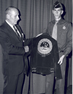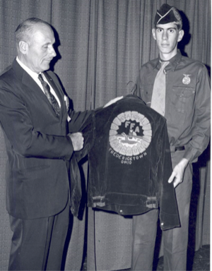 In this 1968 photo, David McCoy of Fredericktown, Ohio, displays an FFA jacket along with vocational agriculture instructor J.H. “Gus” Lintner. The blue jacket originally debuted at the 1933 National FFA Convention.